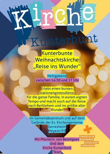 An Heiligabend feiern wir auch in diesem Jahr eine Kunterbunte Weihnachtskirche als Stationen-Gottesdienst für die ganze Familie. Groß und Klein sind herzlich eingeladen!
